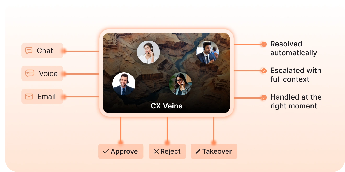 Azeon handles routine questions on its own. It brings in a human when the issue gets complex or sensitive. This can be based on rules you set or customer signals like frustration. When it hands off, the full context goes with it. Agents step in ready, not blind.